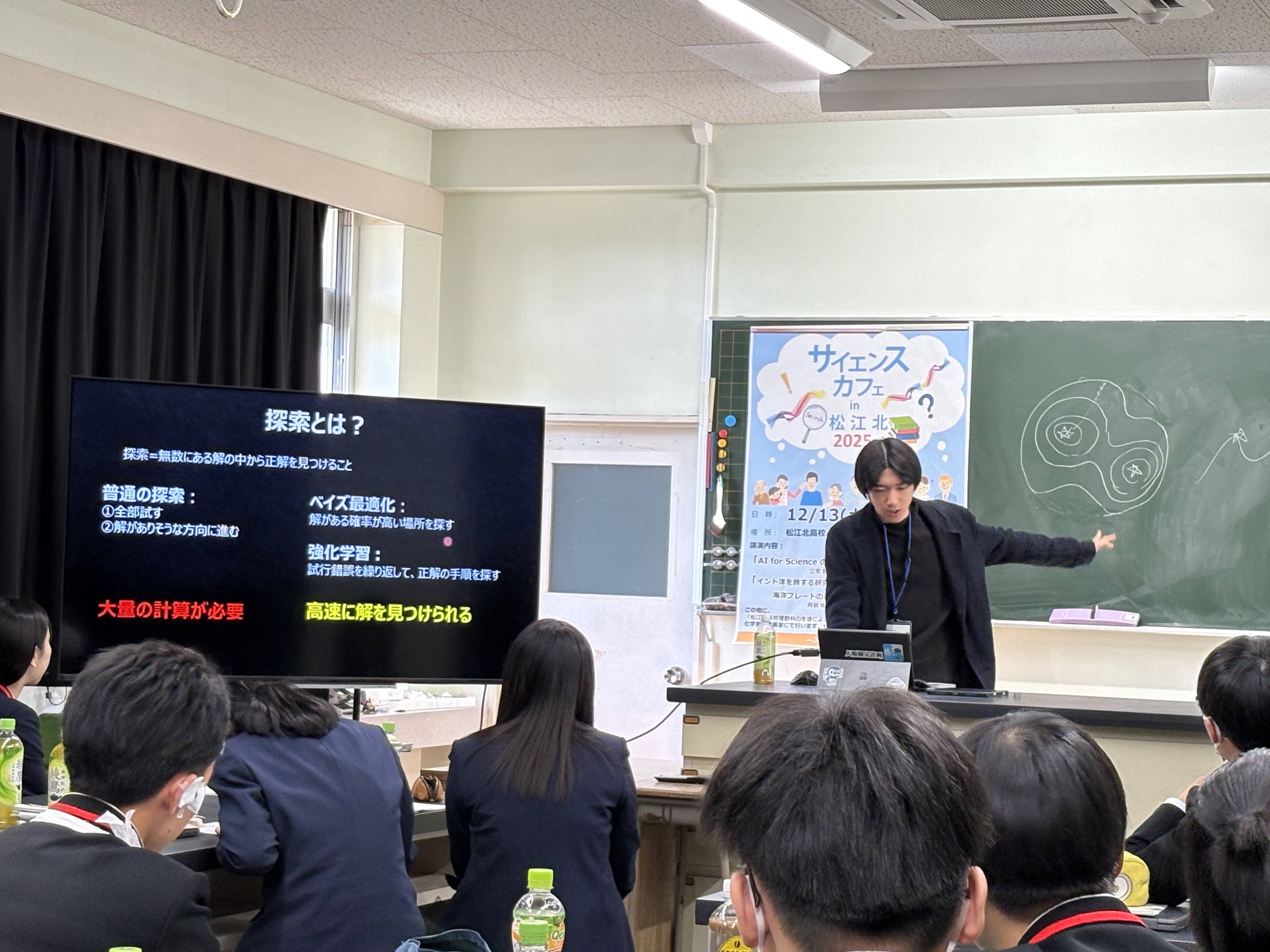 Science Station (以下、SS)では、毎年、島根県立松江北高等学校と連携して「サイエンスカフェ in 松江」というイベントを開催してきました。 このイベントは、松江北高校とSSが共催する形で開催されており、カフェのような場所でお茶をしながらサイエンスについて語らうことを目的とするものです。今年のサイエンスカフェ in 松江北ではSSメンバーによるトークに加え、松江北高校理数科の生徒さんたちの研究の中間発表を拝聴し、研究に対するアドバイスを行いました。