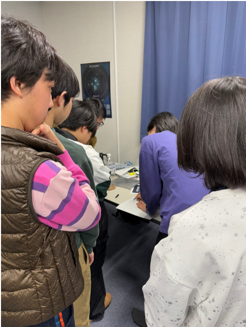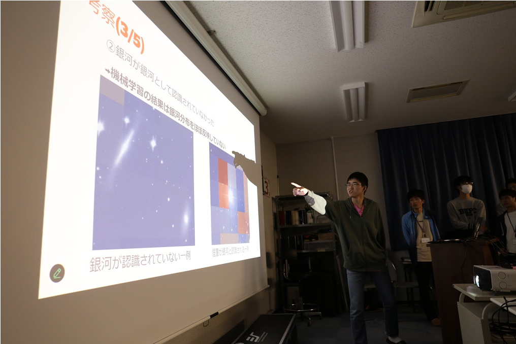 研究発表では、緊張しながらも、研究内容を初めて聞いた人にもわかるように上手く発表することができ、質疑応答にもしっかり対応できていました。その後のディスカッションでもA班の人達と研究内容に関してさらなる議論ができ、有意義な時間を過ごせました。その後TAによる学生生活紹介および研究紹介がありました。様々な研究トピックや実際の大学生活を聞くことができ、とても熱心に聞いていました。さらに木曽観測所サポータークラブの皆様による天体観望会も行われました。雲が多く、あまり観望を行うことはできませんでしたが、様々な望遠鏡の紹介やお話を聞くことができ、とても盛り上がっていました。