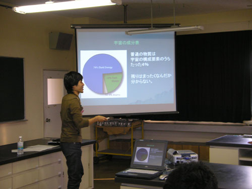今年のノーベル物理学賞の話を導入に、天文学者ときいてどんなイメージだろう。毎日夜空 を見上げている 浮世離れしたロマンチストだというイメージがよくかたられますが、そんなこ とないということを話しまし た。天文学って大きく何をしているか、から始まり、天文学に使 われている税金、天文学(基礎科学)って 一体なんの役に立つの?などを、科学と社会の関わ りをまじえて話しました。理系の政治家、官僚がいない など、日本の問題を話したあたり、皆 熱心にきいていました。(聞いてくれていたはず)