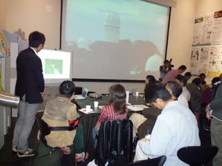 今年が世界天文年である事の紹介や天文関係の話題に加え、キットを用いた15倍の組立望遠鏡の工作を行いました。レンズのはめ込みや筒の組立など、参加者それぞれが注意深く熱心に作成する様子が見られました。当日は残念ながら曇りのため、外での天体観測は実現できませんでしたが、室内での月面クレーターのポスターを用いた観察は人気で、時間ぎりぎりまで望遠鏡を手放さない人も少なくありませんでした。今回の経験が、天体現象や望遠鏡の原理に興味を持つきっかけになることを願っています。
