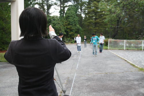 実習1では視角を使って距離を測ることを学び、各班とも班内で協力して効率良く実験や計算をしていました。実測距離との誤差についての考察では、靴の高さや姿勢などの問題だという考えが多く、平均身長を使って計算したという点に気付くのは難しかったようです。