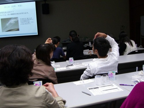 藤貫は「生命の起源と進化~宇宙という巨大なフラスコ~」というタイトルで生物学の観点からのアストロバイオロジーについての授業を行いました。授業では「生命とは何か」、「生命はどこからきたのか」を テーマに生命の起源と進化について話しました。まず、生命を定義する二つの機能、「自己複製」と「代謝」を紹介し、また生命を司るDNA、RNA、たんぱく質の流れと役割について説明されました。 次に、生命ができるまでの化学進化の流れに内容を移し、生命への発展の過程において原始大気、海底熱水鉱床が重要な役割を果たしていることについて話しました。そして実際にDNAを目で見てみよう、ということで DNA抽出実験を参加者のみなさんに行なっていただきました。若い方から年配の方まで、来場された皆様が楽しんで実験を行なっていた様子が非常に印象的でした。今回の講座と実験により生命の起源と進化について より理解が深まったのではないかと思います。