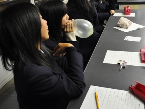 次に、宇宙の始まりはどうなっていたのか説明がありました。宇宙は膨張していていることについて紹介され、私たちが観測する星の光がドップラー効果によって赤くなる赤方偏移やハッブルの法則について説明がありました。宇宙のイメージをするために、風船に点を書いてこれを膨らませてみる実験を行いました。生徒さんは、宇宙の膨張についてイメージができ、宇宙に対して親近感がわいたようでした。