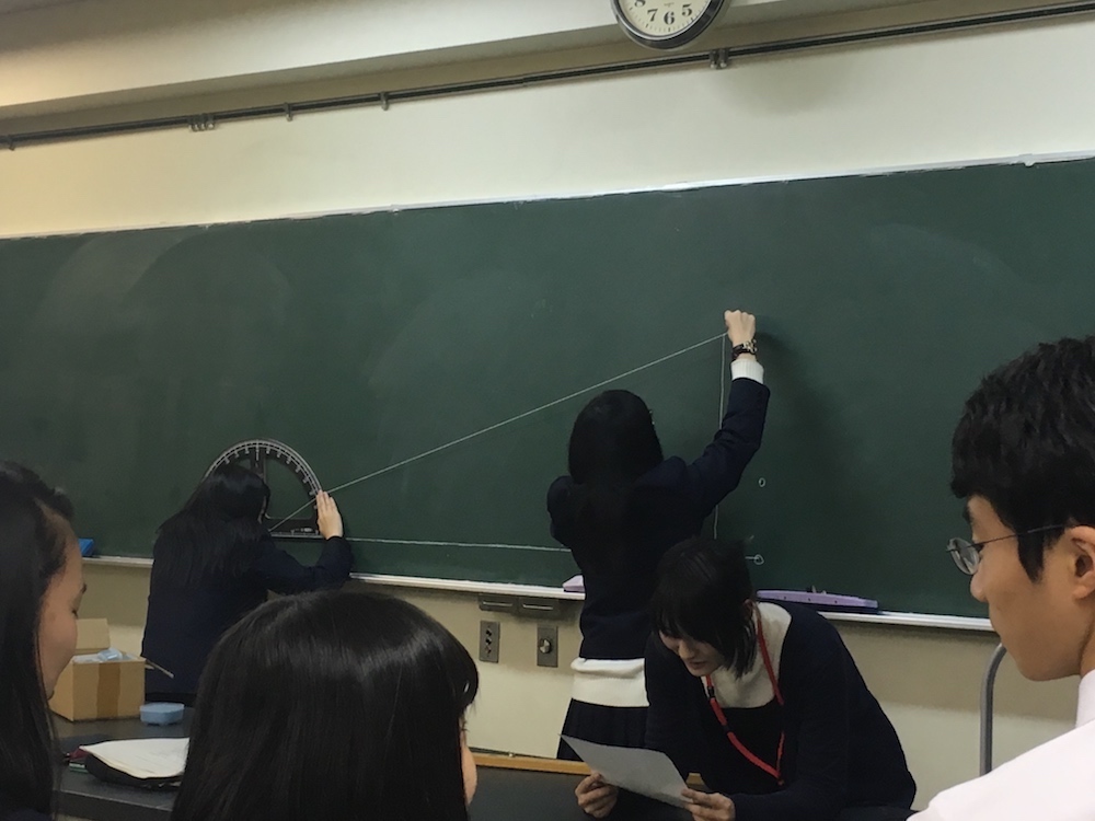 後半の実験では紐と台、永久磁石、グラファイトを用いて炭素の磁化率を測定する実験を行いました。 磁化率とはある物質の周囲に磁石があるときにどの程度が磁気を帯びるかを示す物質固有の値です。実験開始直後は具体的な実験操作の指示は出さなかったのですが、各々が試行錯誤しながら楽しそうに実験を進めている様子が印象的でした。
