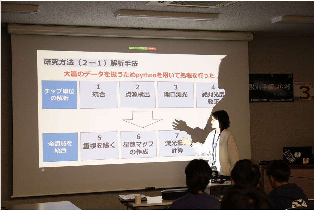今回の銀河学校で生徒たちは観測から得た膨大な生のデータを処理・解析し、その結果を議論することを通して天文学の研究の様子や面白さを垣間見ることができたのではないでしょうか。多くの生徒が「議論を通して理解が深まり楽しかった」や「とても貴重な体験だった」などと話しており、この4日間は有意義かつ貴重な経験になったのではないかと思います。最後に、運営にご協力いただいた木曽観測所サポーターズクラブの皆様、助成していただいたこどもゆめ基金に感謝を申し上げます。